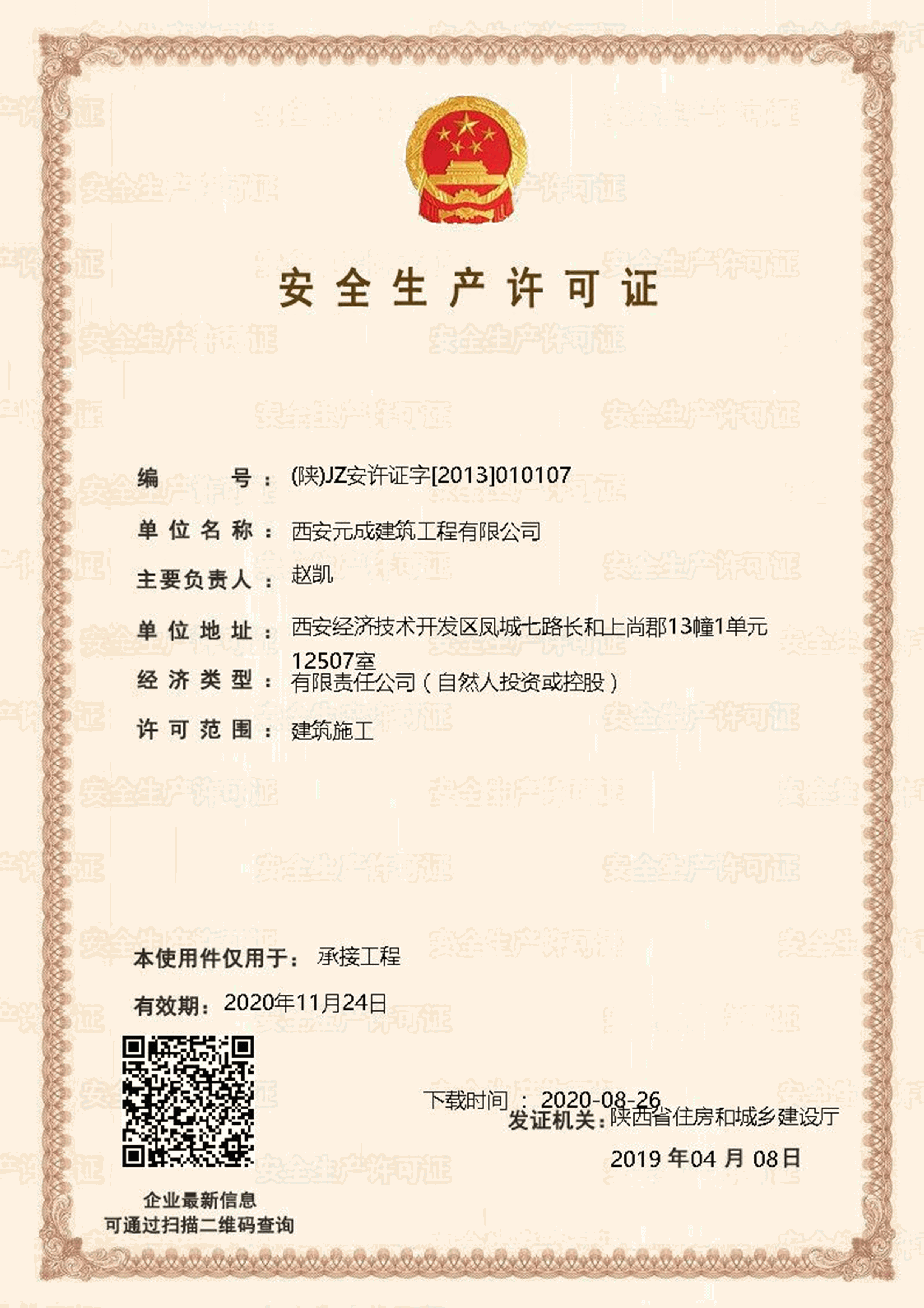 西安元成建筑工程有限公司成立于2012年,是一家擁有建筑工程、市政公用工程、石油化工工程、機電工程施工總承包貳級;鋼結構工程、防水防腐保溫工程專業(yè)承包貳級;電力工程、水利水電工程施工總承包叁級;建筑機電安裝工程、輸變電工程、環(huán)保工程專業(yè)承包三級;模板腳手架專業(yè)承包、勞務分包等綜合性施工企業(yè)。